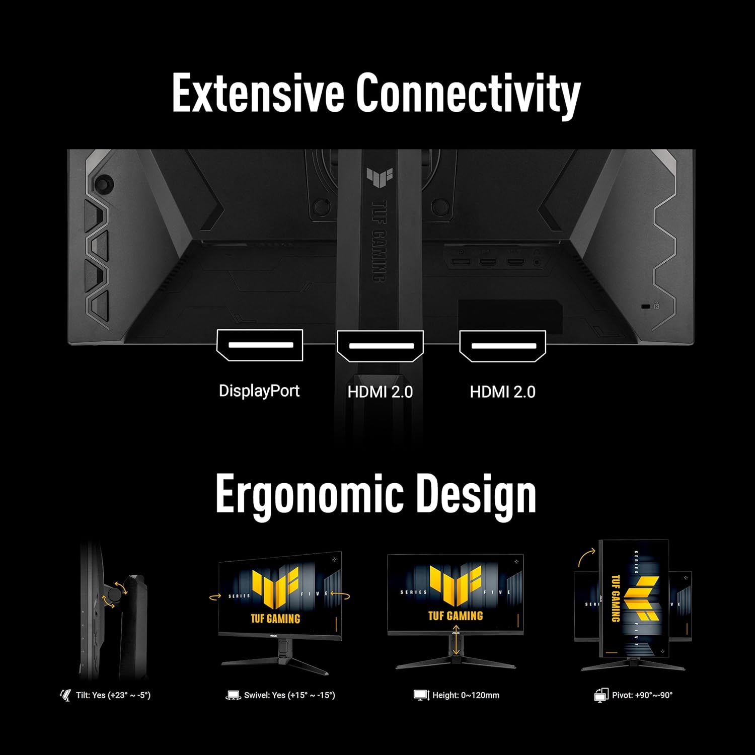 Feature SET:-24.5-inch Full HD (1920 x 1080) Fast IPS gaming monitor with ultrafast 280Hz refresh rate (supports 144Hz) designed for professional gamers and immersive gameplay-Fast IPS technology enables a 1ms response time (GTG) for sharp gaming visuals with high frame rates.-ASUS Extreme Low Motion Blur Sync (ELMB SYNC) technology enables ELMB together with G-SYNC Compatible, eliminating ghosting and tearing for sharp gaming visuals with high frame rates-Certified as G-SYNC Compatible, delivering a seamless, tear-free gaming experience by enabling VRR (variable refresh rate) by default-High Dynamic Range (HDR) technology with professional color gamut delivers contrast and color performance that meets the DisplayHDR 400 certification-Connectivity ports include DisplayPort 1.2 and HDMI (v2.0) x2I had so many issues with my previous monitor, including:-input lag-SO MUCH Screen TEARING-60 fps max refresh rate-it was only 19 inchesTHIS MONITOR JUST BROUGHT WHOLE NEW MEANING TO GAMING AND IMMERSION!What i love:-Size, a massive upgrade from my previous 19 incher-refresh rate, a GINORMOUS UPGRADE from my previous 60hz, now its 240hz and its JUST BUTTER! SO SMOOTH-INPUT LAG is night and day the biggest change for me, im winning way more gun fights then before in fps-so many settings to tweak this monitor to ur liking, ASUS has done a decent job on UI-My favourite setting is 60 overdrive, 80 brightness and 80 contrast, in racing mode with crosshair enabled LOVE it-The eyecare really makes difference, i can game for bare hours without any eye-fatigue- I love the fact that its g-synch it just got rid of alll screen-tearing issues for me-I love the design, its simple, not overkill and super ERGONOMIC with SWIVEL, HEIGHT ADJUSTABLE, and YOU CAN ROTATE THIS DISPLAY ALL THE WAY AROUND if you would like the portrait experience- I can just go on and on and on, but this is FINALLY FUTURE PROOF, i plan to run it to the ground before my next upgrade!CONS- I DIDNT DISCOVER IT ANY SOONER!!!!!!!