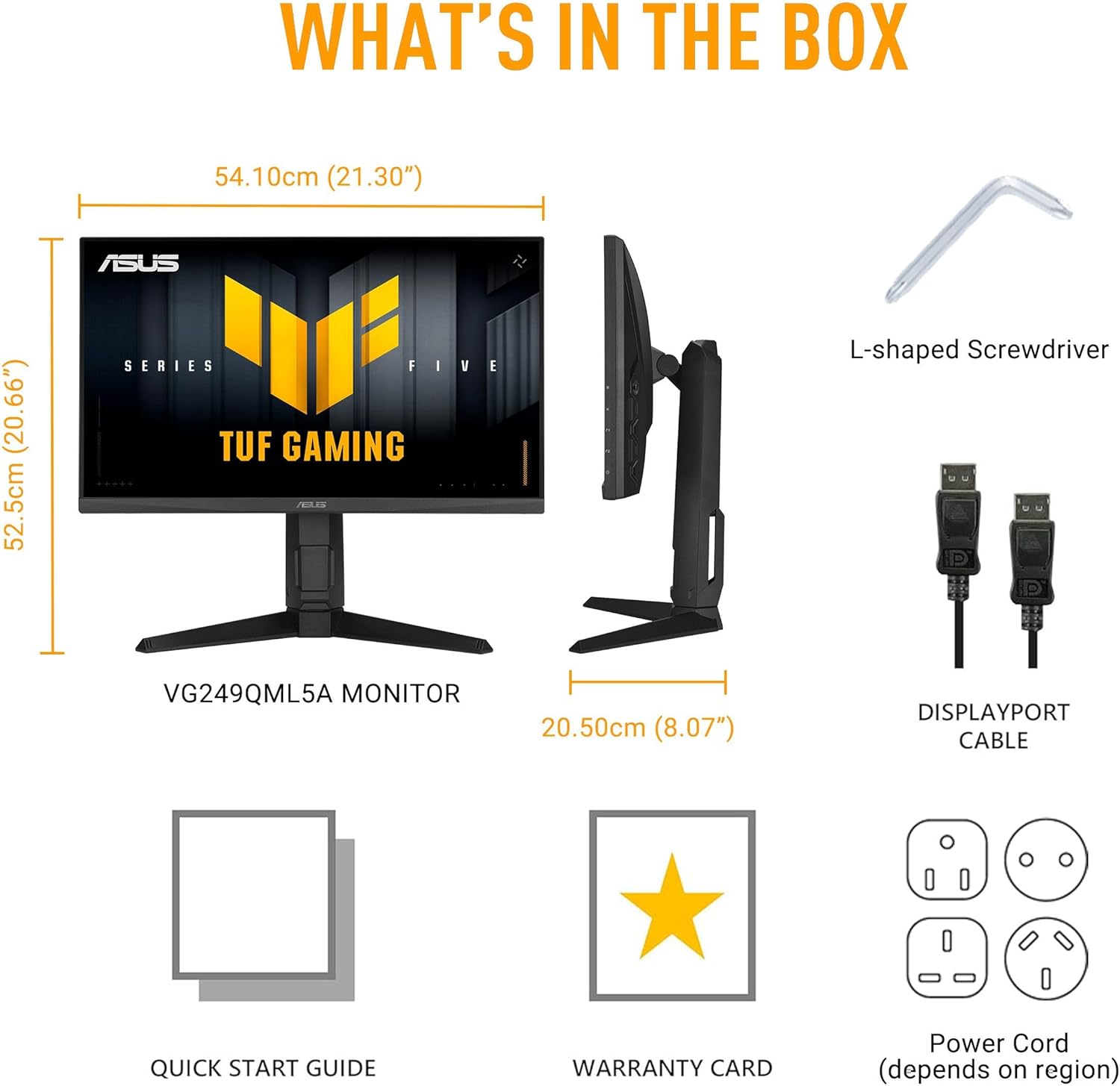 What’s in the box: DisplayPort cable, L-shaped Screwdriver, Power cord, Quick start guide, Warranty Card