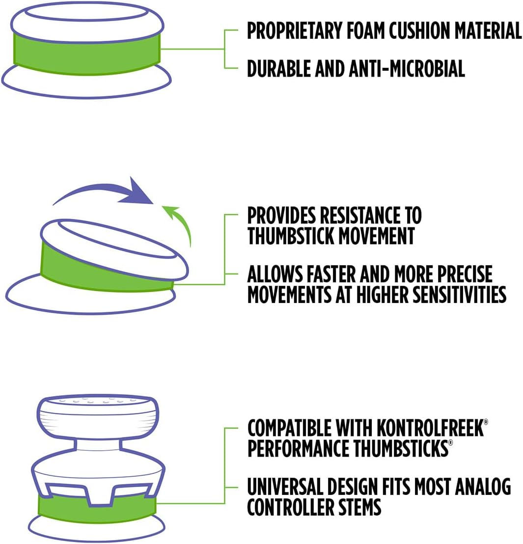 Features Frenzy Performance Thumbsticks for precise small movements; 3-strength Precision Rings for resistance and shock absorption; reduces wrist, hand, and thumb fatigue; improves accuracy at high sensitivity. Galaxy Performance Thumbsticks optimized for precise control; 3-strength Precision Rings to increase in-game sensitivity with resistance and shock absorption; ergonomic comfort. Inferno Performance Thumbsticks designed for smaller precise movements; 3-strength Precision Rings adding resistance and shock absorption; ergonomic design for comfort and reduced fatigue.