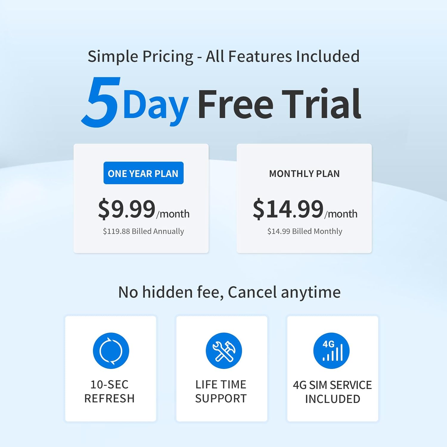 • 🚗 No hidden fees: Straightforward $9.99/month plan (1-year subscription) includes SIM data.