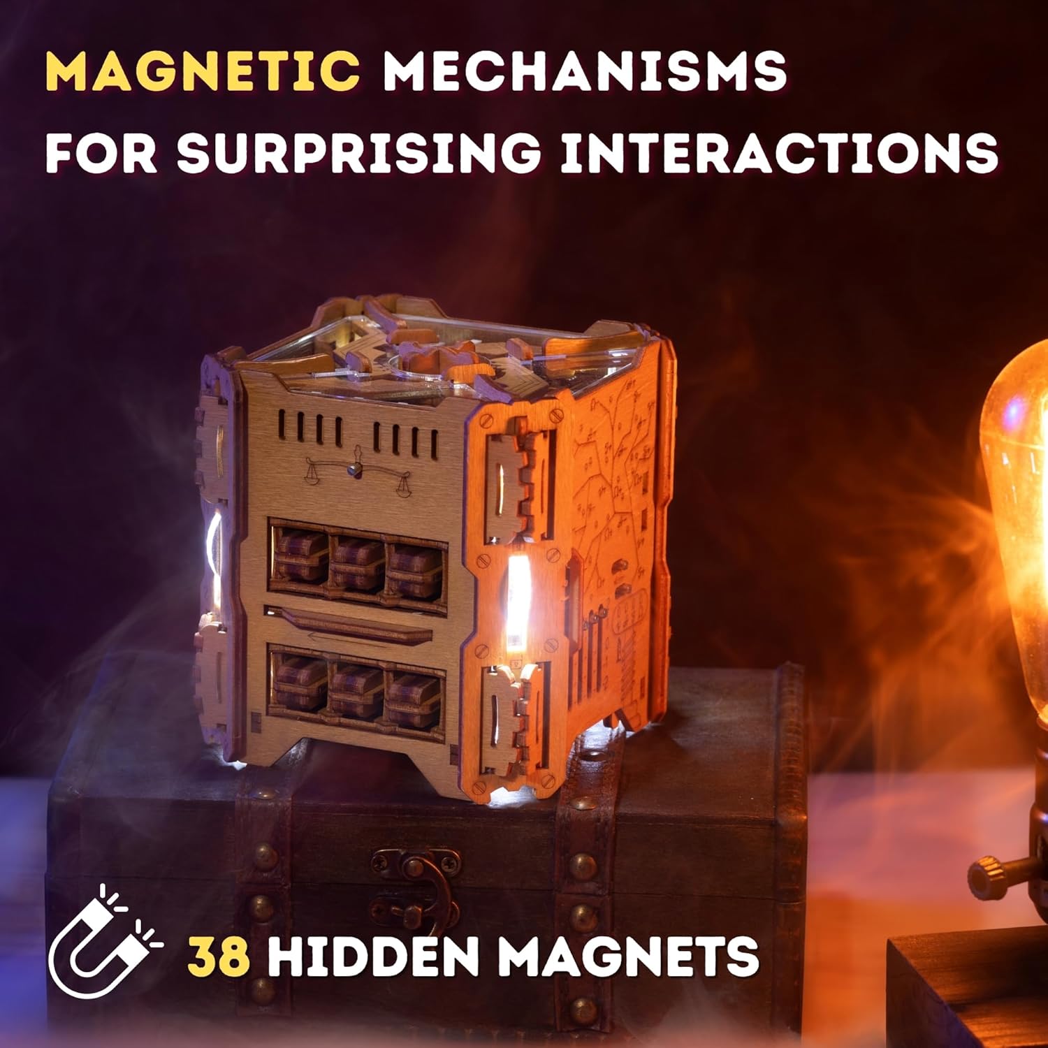 - Puzzle Type: Electro-mechanical escape room style with 38 hidden magnets